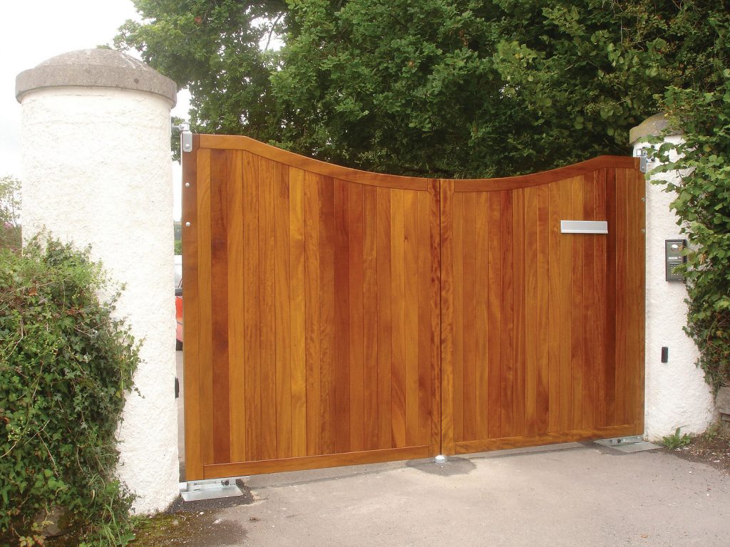 A framed ledge and braces gate with a convex top rail. The boards are tongue and grooved with v joints and are recessed into the frame. This allows for expansion and contraction. The boards are fixed to the frame with stainless steel pins and are filled the sanded. Designed as a manually operated gate it […]