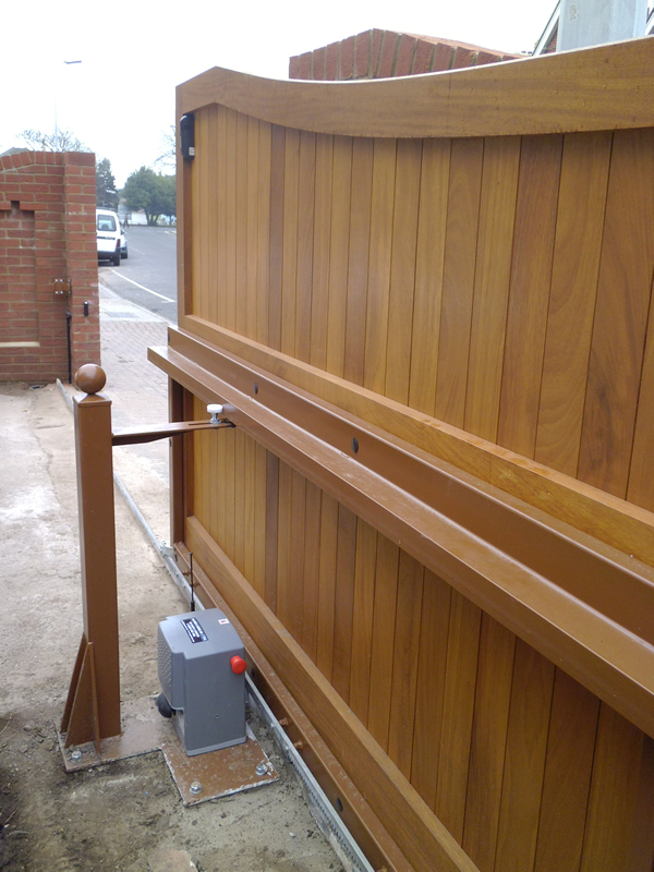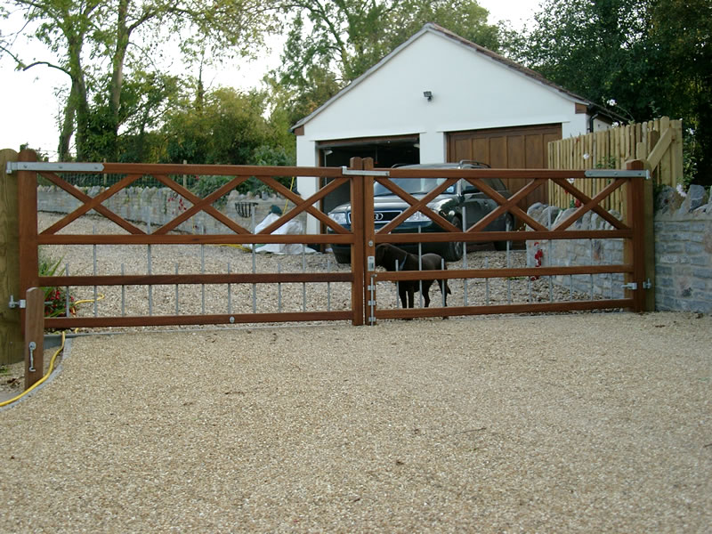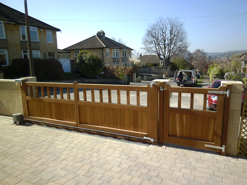Manual flat sliding gate in stained idigobo. Bristol Dorset County gate