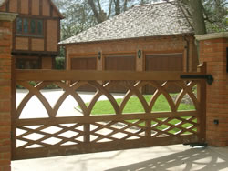 Convex wooden driveway gate in iroko Above ground automated swing driveway gate. Wiltshire