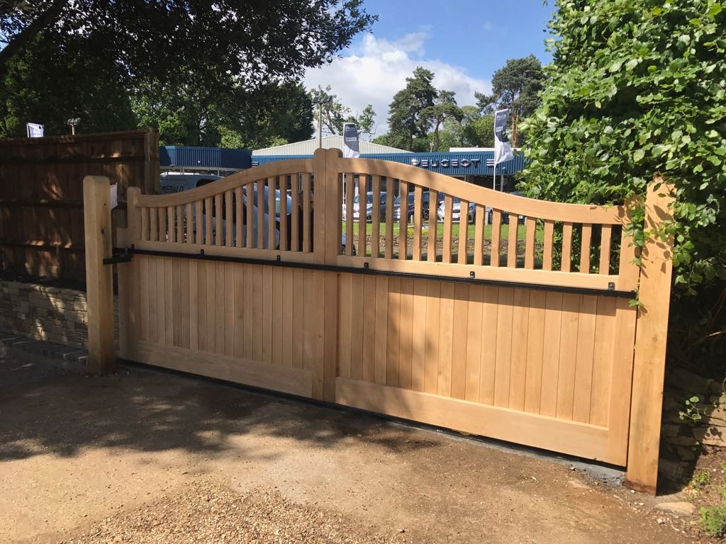 Flat automated swing gate in oak with stained finish. South Bristol