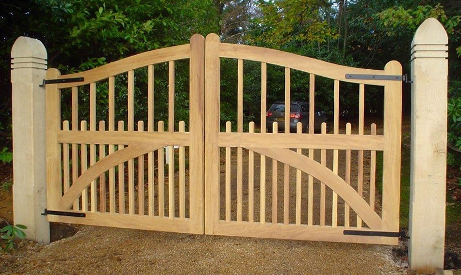 Flat automated swing gate in oak with stained finish. South Bristol
