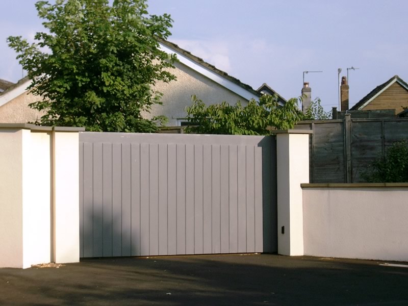 Flat auotmated swing gate. Painted sapele. Surrey
