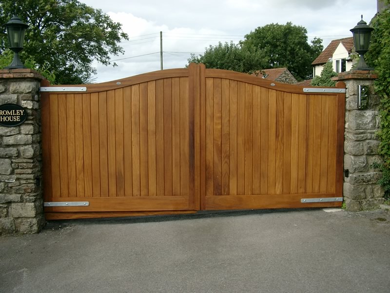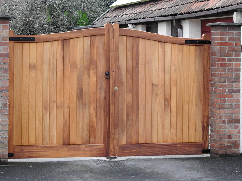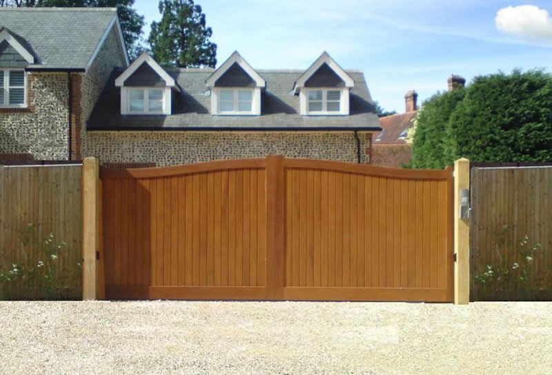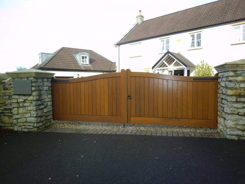 Convex wooden driveway gate in iroko Above ground automated swing driveway gate. Wiltshire