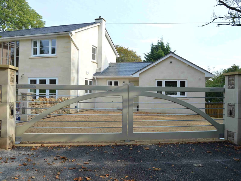 Entrance gates pair. Hardwood and galvanised steel bars. Swing, automated in painted sapele. Bath, Somerset