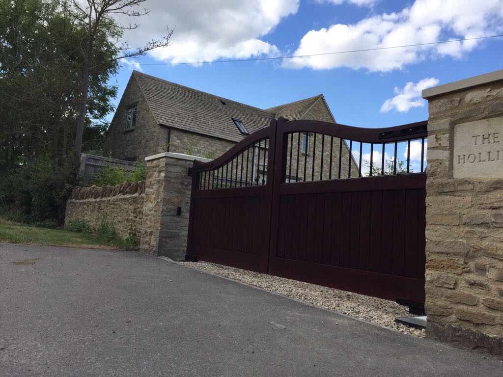 Manual flat sliding gate in stained idigobo. Bristol Dorset County gate