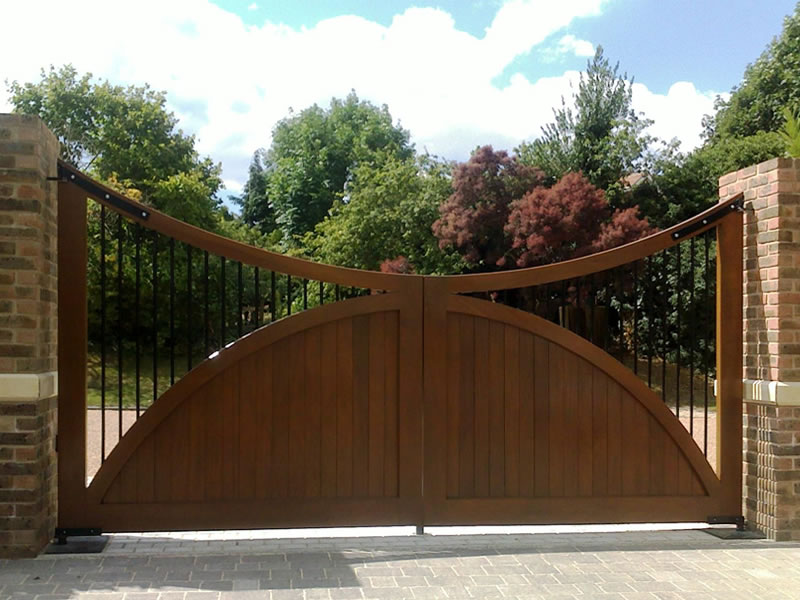 Concave wooden driveway gate with steel spindles – Balmoral A1
